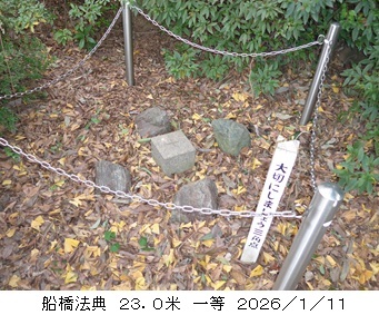 JR武蔵野線「船橋法典」の南500メートルの住宅地に閉鎖された大きな会社寮があり、その前庭の植え込みに見られます。標石は18センチメートル角で上面の各辺には面取りが見られます。この三角点はもともと、1891年(明治24)に設置されましたが、1991年(平成3)に現位置に移転されました。