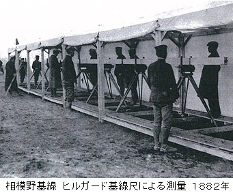 相模野基線の設定以前にも局地的、実験的な測量のため基線が設けられた実績があります。 1872年(明治5)にお雇い英国人マクヴィーン(Colin Alexander McVean 1838~1912)、ジョイネル(Henry Batson Joyner 1839~1884)の指導により工部省が設定した東京越中島と洲崎弁天間の基線があります。ついで1874年(明治7)、東京本所一ッ目と三ッ目間に設定された本所基線、北海道では1873年(明治6)にお雇い米国人ワッソン(James R. Wasson 1845~没年不明)、デイ(Murray S. Day 生年不明~1884)の指導のもとに、開拓使の荒井郁之助(あらい・いくのすけ 1836~1909)、福士成豊(ふくし・なりとよ 1838~1922)などにより設定された勇払基線と1876年(明治9)に設定された函館助基線があります。1875年(明治8)には内務省地理寮によって「関八州大三角測量」のための基線場として三角網の両端近傍で相模原と那須野ヶ原が選定され、1878年(明治11)に「全國三角測量」の一環として内務省地理局が那須西原で那須基線を設定し測量を実施しています。