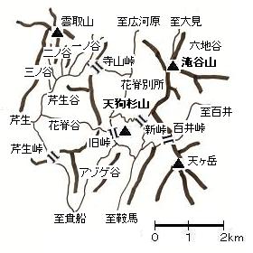 花背峠付近には876.2メートルの滝谷山(またの名を別所山)と、新峠と旧峠の間にある837.2メートル天狗杉山の二山だが、むしろこれよりは別所の西にある雲取山と百井峠の南にある天ヶ岳が有名でよく登られている。雲取山は比叡山より高い三角点があるが、もはや京都市から、はみだしており天ヶ岳はこれとは反対に京都市内にあっても三角点はない。滝谷山や天狗杉山は道のすぐ際にあるので、これだけわざわざ一日かけて登りにいくよりは雲取山や天ヶ岳と合わせて計画してもよい。また旧峠から林道を南へ向かい途中から尾根伝いに鞍馬山経塚をへて貴船口までも山歩きのよいコースだ。