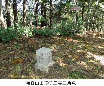 花背新峠のバス停から10メートルほど南に下がったところから東北の方向へ広い道がついている。これが大見まで行っている道で大見尾根とも呼ばれる。バス停のすぐ東からも東北方向に道があるが、別所の集落に出てしまう。前者の大見へ行く広い道はずっとなだらかで、よく利用される道だ。花背峠から1キロメートルも行かないうちに大きな杉の木が4,5本ある杉峠に達する。峠といっても、なだらかなので昔は大抵、知らずに通りすぎてしまっていたが、いまはNTTの巨大な鉄塔がある中継所ができており、ここまで車道になっている。杉峠の先に花背山の家へ降りる道と百井キャンプ場へ降りる道が交差している和佐谷峠を通過する。道が尾根の東側にかかってきたころ(進行方向の右に相当高い山腹が見えだしたころ)に滝谷山(別所山)への道標があり三角点まで難なく到達できる。花背峠から50分かかる。展望は以前は琵琶湖が少し見えたが近年は樹木が茂り見通しは得られない。頂上の北はクマザサのなかに踏み跡がありこれをたどれば10分ほどで大見尾根の道に出られる。大見尾根は林道の拡幅をしており、ひんぱんにバイクが通るので注意したい。花背峠から大見尾根経由大見までは2時間の行程だ。以上は2013年(平成25)10月に確認ずみ。NTTの巨大な鉄塔は2019年(平成31)に撤去された。