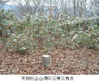 この三角点は新峠と旧峠の中間にあり、どちらからでも行けそうだが、うまくルートを選ばないと、ものすごいブッシュで難しい。旧峠へは前出のように谷つたいによく踏まれた道を入って、行き途中で小さな滝を巻く。峠間近になると石畳みの道になり昔の姿がしのばれる。峠には大きい杉の木がありその下に地蔵の入った祠がある。私は1960年(昭和35)に一度この峠から天狗杉山の三角点を目指したが、相当のクマザサで、当時のことばで「猛ジャン」(猛烈なジャンジャン、薮こぎ)といい踏み跡もまったくなく峠から30分かかった。1998年(平成10)11月に再訪したときは、旧峠の東の杉林に天狗杉山への道標があり急な杉林を少し登ると笹が切り開かれ頂上まで道がついており、旧峠から10分程度で到達できた。昔の薮こぎが夢のようだ。頂上間近に大杉が4、5本あり目印になる。頂上は潅木で囲まれていて展望はよくない。あまり人が来ないとみえて、三角点標石も傷がつかずに残存されている。頂上から東北へ切り開きがあり、笹と桧の植林の境界にそって花背新峠まで道がついている。この間、頂上から20分かかる。これを逆に登るとすれば新峠のバス停から20メートル別所よりの西南の谷から入るが、目印が少なく分かりにくい。2002年(平成14)12月に再々訪したときも変わりがなかったが、紅葉も落ち葉となり正面に花背、杉峠の巨大な無線鉄塔が望めた。山頂には「天狗杉」とともに「花背山」の表示板があった。