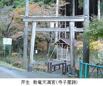かつては花背旧峠から西へ向かう小径がついていたが、現在は車道になっている。この道はしばらく山腹にそって、やがて谷に入ってしまう。この谷は花背谷といい、杉林に囲まれた典型的な北山の谷だ。峠から30分ほど下ると北から大きな谷が入っている。芹生谷といいその源は雲取山に発している。この合流点から芹生谷にそって100メートルほど北へ行くと、歌舞伎(浄瑠璃)の菅原伝授手習鑑(すがわらでんじゅ てならいかがみ)で有名な「寺子屋」の跡があり勢竜(せりょう)天満宮が建っている。「寺子屋」の段は、平安初期に左遷された菅原道真の子をともない芹生に落ちのびた武部源蔵が、迫る追っ手にわが子を身代わりにする筋だ。さらに芹生谷をつめて行けば三の谷、二の谷の出合を通り、寺山峠あるいは雲取峠に出られる。一方、先の合流点から西へ行くとすぐに芹生の集落に入る。芹生はもはや京都市ではない。かつては50軒ほどの、茅葺きの家や分校もある山村であったが、現在は数軒、常住は1軒だけになってしまった。茅葺きの屋根もトタンで覆われ、あるいは瓦にかわってしまった。40年前はこのあたりは北山銀座と呼ばれ山歩きの人たちが最もよく行くところであったが、いまは少ない。花背別所から寺山峠を経て芹生谷を下り芹生の里を通りさらに医王谷に入り、魚谷峠を経て松尾谷から雲ヶ畑に出るコースは、部分的に荒廃してしまった道や、逆に立派な車道になってしまったところもあるが、北山を知るうえに最もよいコースだ。