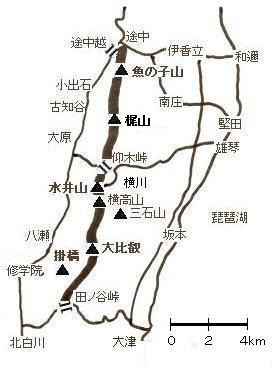 (大比叡 848.3メートル、掛橋 442.5メートル、水井山 794.1メートル、梶山 681.4メートル、魚の子山 552.4メートル)