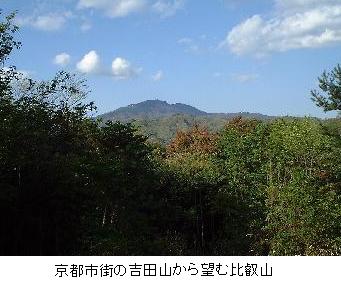 一等三角点があるのは東の大比叡のほうだ。京都市街でも東山に寄った東南部からであれば明らかに双耳峰に見えるが、松ヶ崎あたりの北寄りからみる四明岳だけが独立峰のように見える。四明岳は838メートルであり大比叡より低いが、幾分市街寄りなので高く見えるのであろう。