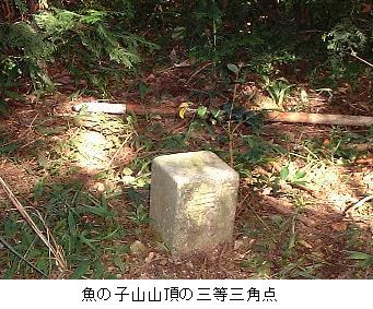 いつごろから「魚の子山」という、めずらしい名前で呼ばれるようになったか分からないが、最近出版された芝村文治氏の「京滋百山 三角点を行く」に掲載されているように「宮めずら」と呼ばれることもあるが、これはさらに北のピークにあたるようだ。いずれにしても長い間、名前がついていなかった。1960年(昭和35)にはじめて登った。途中のバス停から東南へ1キロメートルほど行くと還来神社(もどろきじんじゃ)があるが、この神社の向かいの谷にはずっと道がついている。谷のなかほどで尾根つたいの道と、谷つたいの道とに分かれるが、谷つたいのほうはすぐ消えてしまう。地形図のとおり行けば、半時間程度で三角点に到達できる。三角点の北側は暗い杉林だが南と東は開けており琵琶湖が美しい。西には木々の間から天ヶ森が望める。3月の中旬、京都では、めずらしいギフチョウが群がってとんでいるのが見られた。下り道は途中越のすぐ下の谷へ降りられる道がついていた。この逆コースを2000年(平成12)9月に行った。三谷口バス停から500メートル北へすすみ東側の林道に入る。主稜ちかくまで林道があり、さらに南北に延びており北へすすむが、道は手入れされてなく廃道にちかくなっている。この林道の北端の手前50メートルの地点から主稜に上ると頂上の三角点に到達できる。林道入口から40分ほどかかる。また南北に延びている林道の南側はいくつもの岐路があるが、まともに降りられる道は発見できなかった。