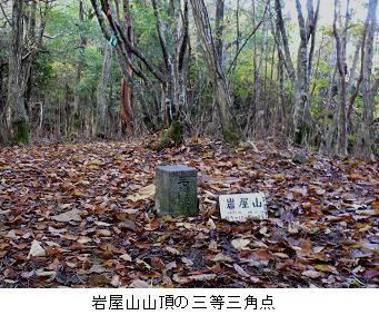 1999年(平成11)10月に久しぶりに岩谷から登り再訪した。小野郷の岩谷の入口には岩戸神社と落葉神社の二社が同一境内にある。落葉神社は源氏物語に出てくる朱雀帝の皇女落葉の宮が祭神といわれている。岩谷には延長1500メートルの林道があり、この終点の少し手前から林のなかに入る。かなり荒れており岩谷峠への取りつきは分かりにくく地形図では谷の中央に道がついているようだが、実際は中央よりかなり北の山腹を巻いている。峠から山頂までは身の丈ほどの笹が茂っているが、道は明瞭についている。神社から1時間少しで到達できる。山頂からは眺望は得られないが、南へ少し尾根をたどると雲ヶ畑の持越峠方面が望める。2005年(平成17)11月には岩屋山から縁坂峠、青谷峠、岩谷峠をへて尾根つたいに登ったが、笹枯れ現象が著しく楽に到達できた。