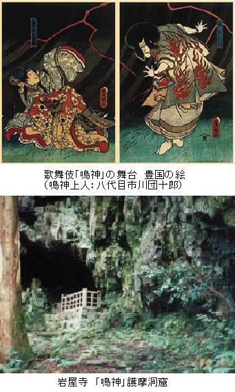 この山は1701年(元禄14)に作成された実測大絵図(中井家作図か)によると「岩屋山」として載っている。雲ヶ畑行きのバスの終点、岩屋橋で降り、分かれ道を左へ行くと20分ほどで岩屋寺に着く。岩屋寺は正式な名前を岩屋山金光峰寺志明院(しみょういん)といい平安初期に創立されたものだ。本堂は懸崖に架してつくられて、そこに不動明王が祀つられている。また境内には飛竜の滝というのがあり、その後ろに巨大な洞窟で弘法が護摩の行法をしたといわれている場所がある。歌舞伎十八番の鳴神(雷神不動北山桜、なるかみふどう きたやまざくら)はここを舞台としている。鳴神上人は志明院の僧であったが、宮中から出産の祈祷を命ぜられ、みごとに皇子が誕生したのにかかわらず、なんの恩賞にも接せず、さらに雨乞いの祈祷を命ぜられたので、怒って雨をこの洞窟に封じこめてしまった 。困り果てた宮廷では洛中一の美女とされる雲の絶間姫をつかわせて上人を惑わして、その行を破ったという筋だ。話のそれたついでだが、歌舞伎「寺子屋」の舞台となった芹生や「鞍馬山だんまり」の鞍馬が雲ヶ畑と位置が接近しているのは興味深い。なお岩屋寺はシャクナゲの名所として知られ、この季節には観光バスが山門まで来るほど賑わっている。