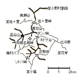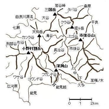 宮谷川が久多川と合流するところから地形図の道のとおりに北上する。合流点から800メートルほど行ったところに、大きな杉の木がありしめ縄が巻いている。この前の橋を渡り、つぎの橋のところで地形図では実線路が終わっているが、後で言うミゴ谷の出会までは車道がついている。上の町をすぎ、さらに田圃にそってすすむと右から大きな谷が入りこんでいて、その出会いに三軒屋が建っている。この三軒屋こそ京都市最北の居住地といえる。なお右の大きな谷は市後谷という。三軒屋から500メートルほど北のところで、今度は左から大きな谷が入っている。これは長治谷といわれている。つぎに右からミゴ谷があらわれ、その出会いには貯木場があり、少し道にそって上がったところに地蔵がある。さらに上がったところに、大きい砂防用堰堤がある。久多からここまでは広くてよく分かるので京都を午後に出発すれば、ここまで来て露営すれば翌日の行動が非常に楽になる。ミゴ谷の出会いをすぎて、つぎに左から入りこんでいる滝谷の出会いまではよい道がついている。それ以後は踏み跡程度のもので時折、古い木馬道がつづいている。滝谷のつぎに右からクラ谷が入っている。比較的広い入り口で木馬道もついているから、本流と間違わないようにしなければならない。クラ谷から少し北に、こんどはヒルガ谷が入ってきている。この谷の出会いには材木を切るだけの製材所の跡があり、引き粉が朽ちて残っている。さらに谷をつめていくと本流は三つの支流に同じところで分かれる。この三流の出会いには古い貯木場跡があり朽ちた木が残っている。ここはちょうど、三国岳直下の地形図でいえば等高線の急に密になりはじめているところだ。この三流のうち最も左側の谷はいままでの本流とほとんど直角に西に曲がっており踏み跡さえない。真ん中の谷は小さなもので入り口に炭焼き釜の跡がある。最も右側の谷が本流のつづきと考えられ、地元の人は岩屋谷と書いて「いや谷」と呼んでいる。