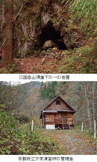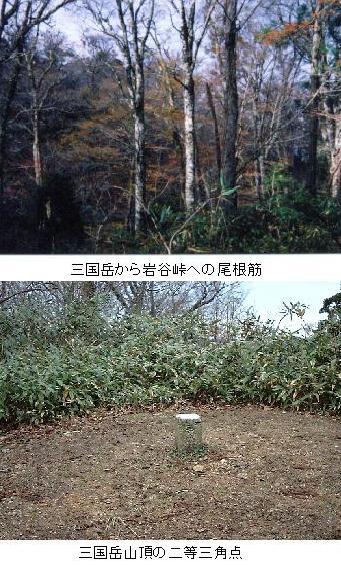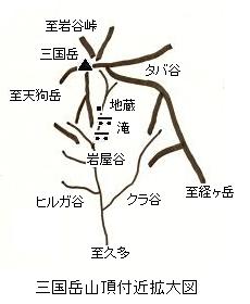 三国岳山頂へは、これをつめればよいのだが、入り口には大きな滝が二つありとてもすぐには入れない。そこで、いったん真ん中の谷に入り炭焼き釜跡の向かい側の東の山腹(これは最も右の谷と真ん中の谷との間の尾根の末端になる)を巻くのだが、かすかな踏み跡がついていて、わけなく右の谷の上部に出られる。右の谷に出たところより、少し登ると西側の山腹に地蔵が祀られている洞窟がある。このあたりから水も少なくなり、沢の右岸、左岸と踏み跡を見つけながら本流にそって、なるべく西寄りにつめる。踏み跡がなくなりかけたころから、非常な急斜面になり、しかも一面にクマザサが生い茂っている。急ではあるが、距離は100メートルたらずで尾根に出られる。尾根に出たところから左を見ると大きな杉木立があり、これを目標に少し登ると杉木立の向こうに三角点が見つかる。久多下の町から前出の三流出会いまで2時間半、さらに出会いから三角点まで1時間半はかかる。山頂からの展望はほとんどなく、木々の間から山また山が見えるのみだ。さて下りだが、三国岳にようやく登り着いた人のほとんどは滋賀県側の桑原に降りる。タバ谷を経て桑原に降りるのが最も簡単で谷を降りれば炭焼きのための道がついている。また朝、久多を出発してその日のうちに京都へ帰るならば、このコースが最もよく桑原から川合を経て梅の木まで車道を歩けば梅の木発の終バスには十分間に合う。