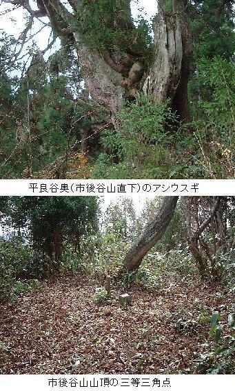 以上は1960年(昭和35)の記録だが近年、滋賀県側の平良から市後谷山頂まで植林道があるという情報を得て、1997年(平成9)6月平良から山頂まで往復した。平良谷出合から林道がついており、しばらくすると左右に大きく谷が分かれる。左股をつめると平良谷出合から1時間で林道終点となる。さらに谷ぞいに100メートルほど、すすむと右岸の山腹に植林道が見つかる。これを登ると尾根筋に台杉の巨木がある。植林道ははっきりしており、さらに登りつづけると道が真っすぐにすすむ、なだらかな道と左に曲がる尾根筋に分かれる。左の道をとり急斜面の尾根を登るが、植林道もところどころ潅木にテープを巻いた踏み跡程度になる。間もなく経ヶ岳からの尾根主稜に達する。このあたりは短い笹で開けており琵琶湖も望める。さらに尾根筋の背丈ほどのクマザサをかきわけ10分ほどで三角点892.1メートルに到達する。平良谷出合から2時間をかかった。私はこの登山ではじめてGPSを持参した。三角点の位置を国土地理院1971年(昭和46)測量の二万五千分一「久多」の地形図から算出すると北緯35度17分45秒、東経135度49分21秒であったが、(後日、国土地理院の基準点成果表で調べたら北緯35度17分45.830秒、東経135度49分21.769秒であった)MAGELLAN、GPS2000による実測では北緯35度17分30秒、東経135度48分58秒であり南北で460メートル、東西で579メートルもの差がある。これは国土地理院の地形図の座標が東京における天文観測で決めた「日本測地系」であるのに対し、GPSの初期設定で地球全体の観測をもとに決めた世界測地系「WGS−84座標系」になっていたことによるものと思われる。2002年(平成14)4月からは測量法で世界測地系に統一されることになった。三角点のまわりは大きな杉の木立で市後谷山の標識が数枚見られる。三角点からは登ってきた道以外に踏み跡もほとんど見られない。帰りは三角点の北東がやや平らな地形なので植林道への下り地点を見失わないようにしなければならない。帰途、山仕事の人達に出会ったが、近年、熊とカモシカが増えているそうだ。2000年(平成12)11月に同じコースで登ったが、車道の終点には熊の檻がしかけられ、植林道はかなり荒れてはいたが、経ヶ岳からの尾根主稜にははっきりした踏み跡がついており、三角点のまわりも刈り取られ開けていた。