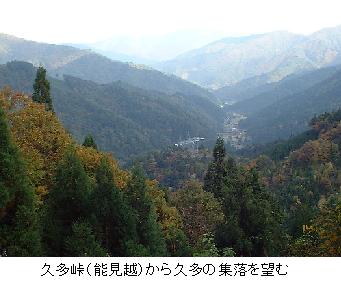 出町を出た広河原行のバスは上賀茂から鞍馬、花背別所、大布施、大悲山口などを経て広河原で終着になっているが、広河原の一つ手前の能見口(のうみぐち)で降りる。バスは午前、午後それぞれ2回きている。能見口は大堰川の源流にあたるところだ。橋を渡り右側の広い車道をすすむと、20分ばかりで能見の集落に着く。かつては20軒ほどの小さな集落だった。能見から、さらに川にそって車道をすすむと左からコウンド谷が大きく入りこんでいる。この谷も立派な林道がついているが、誤ってこちらの谷へ入るような心配はない。道はここからはずっと川の左岸についている。峠の手前でフカンド谷が入りこんで、ここで道は谷と分かれて山腹をつたっていく。能見口から1時間半も歩くと峠に達する。この峠は能見側の住人は能見越といい、久多の住人は久多峠とか久多越といっている。峠からの展望はまったくすばらしく、真正面には比良山系の武奈ヶ岳がそびえ立ち、眼下には久多の集落がよく見える。花背の新峠のような感じがするが、花背峠よりはずっと車も少なく、はるかに山奥で峠らしい峠だ。峠からは車道が北側の山腹を巻いて久多の中心部へ向かう宮谷川に降りている。現在の広い車道ができる以前には峠から、急坂のジグザグ道がついていて夜でも歩けたが、いまは分からなくなってしまった。峠から降りきってしまうと、杉木立に囲まれた宮谷川にそって宮の集落へ、そしてすぐに開けた久多の下の町へ出られる。ここで宮谷川は三国岳から流れてくる久多川と合流し奥山川となって、川合を経て梅の木で安曇川に注いでいる。かつては能見から久多峠を経て久多、川合、梅の木へはよいハイキングコースであったが、いまは車の往来が多く興ざめだ。梅の木からは安曇川方面と途中を経て京都へバスの便があるが、極めて少ない。