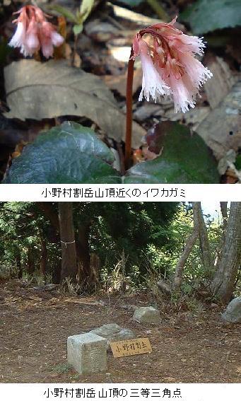 この山は由良川源流の京都大学芦生研究林の境界線上にあたる。長い間、名前がなく広河原の三角点で通っていたが、いつの間にか小野村割岳と呼ばれるようになった。地図にも表れるようになったが、地元の人でもその名前は知られていない。広河原は、以前は北桑田郡にあったものだが、1957年(昭和32)4月に京都市に編入された。かつては、この三角点を征服するには日帰りでは、よほど要領よく行かないと無理であった。広河原の早稲谷上流は支谷が多くなかなか三角点に到達することができなかった。しかし近年、早稲谷の林道が延長され、尾根筋ちかくまで楽に行けるようになった。林道の終点から、いったん小さな谷筋に入るが、入り口から50メートルほどで西側(右岸)の尾根を登る。かなり切り開かれて踏み跡は、はっきりしている。頂上の三角点931.7メートルまで林道から20分ほどで到達できる。広河原下の町のバス停から歩いて2時間たらずであった。昔は薮こぎをしたり、道のない谷をつめたり一日中、三角点を探すのに、さまよったのが夢のようだ。