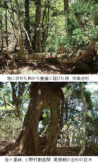 また2000年(平成12)11月には41年前の逆コースとして、市後谷山から経ヶ岳を経て三国岳へ登り久多に降りた。市後谷山から三国岳への尾根には踏み跡と目印のテープがついており薮こぎも迷うこともなく快適な山歩きを楽しむことができた。獣のヌタ場もところどころ見られた。山頂から久多へも道は整備されており尾根つたいに急坂を降りる。岩谷に出たあたりから京都府立大学演習林の立て札が見られ間もなく左岸の「二の岩屋」への道標がある。「二の岩屋」は以前、見つけられなかったが、今回は道標にしたがい分岐点から対岸へ5分ほど登ったところに立ち寄ってきた。分岐点に戻り100メートルほど下流には「一の岩屋」があり「二の岩屋」と同様に地蔵が丁寧に祀られている。このすぐ下流には演習林の管理舎がありここまで林道が久多から上がってきている。久多まで長い道のりを歩いたが、上の町ではサルの大群に出会い、また中の町の大杉は舗装道路がこれを避けて昔のまま残っていた。この大杉は1987年(昭和62)に京都市登録天然記念物になっている。私の手持ちの1957年(昭和32)当時の五万分一地形図「北小松」には独立樹として記載されていたが、現在の地形図には載っていない。