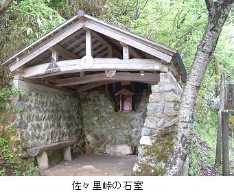 佐々里峠(ささりとうげ)は京都市と北桑田郡との境になる峠だ。広河原のバス停から、さらに車道がついているが、尾花谷にそってよく踏まれた旧道を1時間ほど歩けば峠に到着する。峠には石室があり地蔵が祀られている。この石室は10人程度、休憩できる広さで快適だ。峠からの展望はよくないが、西側の山腹に生えているブナの林はすばらしく、特に新緑のころがよい。峠は京都大学芦生研究林の境界にもあたり北へすすめば、大段谷山の稜線を経て灰野から芦生にでられる快適な道がある。峠から下ると、奥瀬谷を通り佐々里の集落へ、これも1時間あまりでぬけられるが、いまは立派な車道が広河原から由良川までついているので歩く人は少ない。紅葉のころも京都から車で訪れる人が多い。もはや歩いて楽しめる場所でなくなってきている。