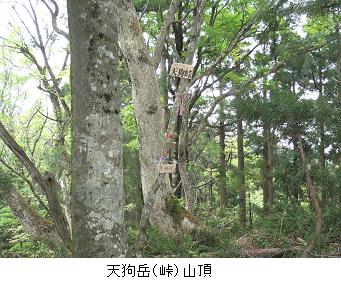 三国岳を頂点として東西に三角点がない主峰が2つある。東は経ヶ岳で三国岳のところで述べた。西が天狗岳(天狗峠ともよばれる)で経ヶ岳に比べると登り難い。三国岳から西の主稜を南下するか、深洞山か、小野村割岳から北上すると地形的には分かりやすいが薮こぎが、たいへんで時間がかかる。天狗岳だけなら、由良川源流の七瀬から西尾根を登るか、久多の滝谷を登ることができる。アプローチのしやすさからは滝谷がよく、滝谷林道の終点から谷をつめることも、503メートル標高点の西から尾根筋を登ることも可能だ。2005年(平成17)5月この尾根筋を登り林道終点から2時間たらずで到達できた。最初は急斜面の植林地であるが、これが終われば三国岳からの稜線までかすかな踏み跡とテープがつけてあり、容易に到達することができた。山頂付近は伏条台杉の巨木が多数あるほか、ブナの原生林が見られた。