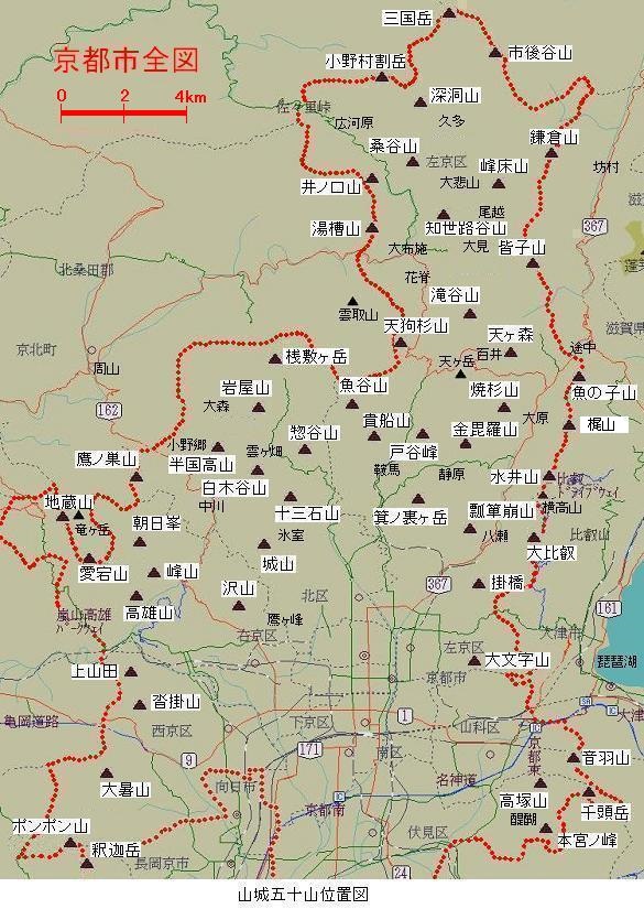 山城五十山の定義を前述のように、京都市内と他府県または市郡との境界上で測量のための三角点がある標高400メートル以上の山とすると、これに該当する山はちょうど50山あり、各々の名称と位置はつぎのとおりになっている。