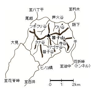 皆子谷には支流が沢山あるが、なるべく左側(西側)の谷へは入らないようにして本谷を登っていく。このあたりは秋になればアケビの実が沢山ぶら下がっている。またマムシもいるから注意したい。この谷をどんどんつめていくと左右ともほとんど同じ大きさの二つの谷に分かれてしまう。西をタナ谷、東をマゴサ谷という。普通はマゴサ谷を登る人が多く道標もついている。マゴサ谷ははっきりした道がついており、頂上直下で東の笹に覆われた斜面を登ると頂上から南に張りだしている尾根にでられやがて寺谷ルートと合流して簡単に三角点に到達できる。また頂上直下から東の斜面を登らずに真っすぐ谷をつめても、少しの薮こぎで三角点に到達できる。