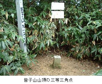 以上は最近では1996年(平成8)4月に確認しているが、以下は1958年(昭和33)の初登山での記録である。当時は道標など、なにもなかったのでタナ谷に入ってしまった。タナ谷をつめるとその源流に杉が伐採された広い貯木場の跡に出る。そこから右手の斜面を登り尾根に出るが道も踏み跡もない。尾根は背の高さをこえるクマザサが密生している。しかし20分も笹をわけて北へすすむと、突然ずっと低い笹で覆われた高原状の場所に出る。ここから東を見ると眼下にマゴサ谷が望める。また東北には木々に覆われた小高い山が見える。これが三角点のある頂上だ。この頂上を目指して笹や潅木をかきわけて行けば20分ほどで到達することができる。皆子谷の登り口から2時間以上かかった。どの谷から入っても皆子山より高い山はないから理屈のうえからは、高いほうへ目指してすすめば行き着くことができるが、クマザサが生い茂り見通しがきかない。