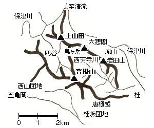 西山というのは広い意味では鷹ヶ峰あたりから愛宕山塊を含めて嵐山、さらに淀川西岸までをいう。しかしここでは特に桂の西に位置する保津川、山陰道(国道9号線)に囲まれた山塊について記す。