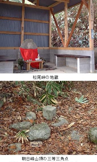 前出の田尻の集落は十軒ほどの小さな集落であり南端に白壁の立派な土蔵もあった。この土蔵の前の広い道を谷ぞいに行くと半時間くらいで松尾峠に達する。松尾峠を目指して谷山川からヒウチヤ谷を登ると、登りきったところに松尾峠の標識があり地蔵が祀られているが、これは地形図の593メートルの位置にある松尾峠とは違い、この南100メートルくらいのところだから注意がいる。松尾峠から東北方向へ少しすすむと杉林のなかから潅木ばかりのところに出て道も踏み跡程度で下り坂となる。この手前の北側の尾根筋には踏み跡がついていて、10分ほどで三角点へ行ける。頂上は樹木に覆われていて展望はまったくないが、頂上から南へ少し下がったとことから京都市街を望むことができる。以上も1960年代の記録だが、現在は、田尻は廃村になっている。松尾峠から峰山にかけて1992年(平成4)から大規模な林道(車道)がつけられている。林道から朝日峰への分岐には道標があり昔ながらの踏み跡をたどり15分で三角点に到達できる。また松尾峠の地蔵は林道にそってではなく、10メートルほど東に降りたところにある。松尾峠から谷山川への下りは、はじめは広い林道だが、次第に細くなり急な斜面にある植林の間の旧道をたどり、やがて谷山川ぞいの車道に出る。槙尾まで1時間かかる。以上は1998年(平成10)12月に確認ずみ。松尾峠から林道をさらに南下すればカヤノキ峠、ウジウジ峠、ダルマ峠、サカサマ峠、首無地蔵を経て愛宕山まで1時間半の道のりだ。