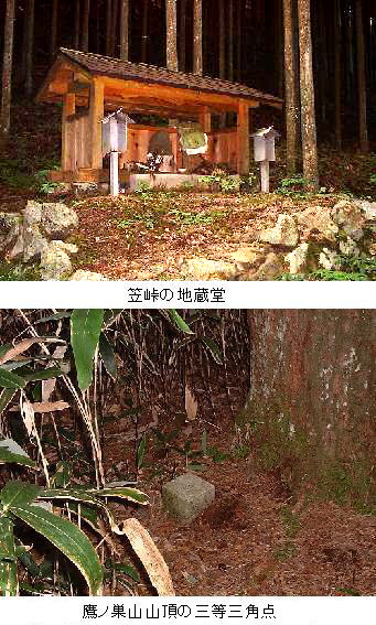 2000年(平成12)10月に再訪した。近年、笠峠はトンネルができ車は峠へ登らない。笠峠への旧道はトンネルの西側、滝ノ町から京都府射撃場への道を入り、徒歩5分ほどで右手の橋を渡ると旧道入り口で車進入禁止になっており、アスファルトの舗装はめくれ無惨な姿になっている。峠には地蔵の祠があったが、40年前と位置が違うようだ。地蔵のすぐ東隣には本道から分かれて林道があるが、これは鷹ノ巣山へはつながっていない。