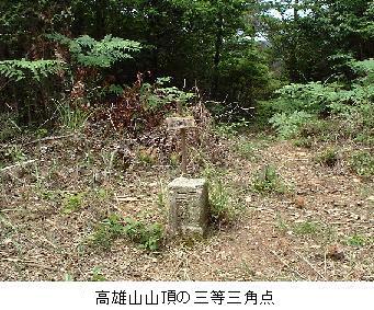 高雄の停留所から石段を降りて清滝川を渡り、また長い石段を登って神護寺の境内に入る。寺の本堂の裏には多宝塔が建っているが、この右側から文覚上人の墓へ行く道がついている。境内の案内板には、文覚上人と性仁親王の墓への道として、登り口付近が図示してあるから間違うことはない。暗い杉林の道を出ると、明るい山腹の道となり周山街道が見下ろせる。この道をどんどん登っていくと山腹の道は、ほぼ平坦になるが、この少し手前から西側の暗い樹木のなかに入る。高雄山への道標や目印はないが、南へ尾根つたいに急坂の踏み跡を少し登ると三角点に到達する。展望は、かつては愛宕山が間近に、また周山街道を取り巻く山々が非常によく見えたが、2000年(平成12)6月、40年ぶりに訪れたときは潅木が茂り、ほとんど眺望は得られなかった。三角点からさらに南へは地形図のとおり尾根道がついている。なお高雄山を経て愛宕山へ行くコースについては愛宕三山の項で記す。