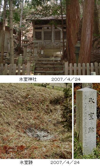氷室は平安時代に皇室の氷を蓄えておいた場所で、いまでもその遺跡らしい窪地が村はずれの斜面に3箇所残っている。また集落の城山よりには氷室神社があり昔、宮中に氷を献上した日にあたる6月15日に例祭がある。神社の境内には