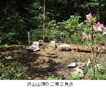 北山丸太の集落として有名な中川まではJRバスで来られる。バスは中川の集落の手前にある菩提道で降り、そこから広い車道を菩提川にそって歩けばよい。最近は車で沢池まで入る人が多い。沢池は山中には、めずらしく大きな池で、昔は貸しボート屋もあったくらい休日は賑わっている。沢池は東側に歩道がついており南に向かうと桃山からつづいている東西の尾根に出られる。ここから沢山の三角点までは、少し潅木をくぐらねばならないが、すぐに到達できる。この山はよく人が来るとみえ、以前は三角点標石が大分削られていた。四隅はすべてハンマーで壊されていたが、1993年(平成5)に更新されている。