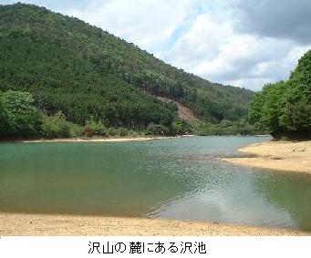 頂上は木が多くて展望は東の方向しかきかないが、三角点から少し戻ったところから沢池の全ぼうが木々の間から望める。山の上にある大きい池なので火山湖のような感じがする。また前出の沢池から尾根筋に上がったところは、ホトグリ峠といい南に降りる広い道がついており、(3)のルートである白砂山の北を通って宇多野へ出られる。中川、沢池、宇多野のルートはハイキングコースとなっており、だれでも間違いなく行けるよい道だ。また宇多野へ降りずに、高雄の白雲橋へ降りる道も整備されて京都一周トレイルの一部になっている。一方、(1)(2)の鷹ヶ峰からのルートは鷹ヶ峰方面には市バスが、ひんぱんにあり、玄琢(げんたく)行きのバスに乗り源光庵前で降りる。鷹ヶ峰は市街にある吉田山や船岡山の高さと同じくらいのところにあり、市街が見下ろせる眺めのよいところだ。また光悦寺という有名な寺もあり観光客が多い。源光庵前でバスを降りると南からきた道は東西に分かれ、バスは東に去ってしまう。西へ行くと学校や光悦寺さらに杉阪方面への分かれ道を通りすぎ急坂の下りとなって、千束に出られる。千束をすぎ道標にそって天神川を少しすすむと、左から原谷が入っている。この原谷と天神川の中間にある尾根は桃山から張りだしており、京都府立大学(元西京大学)の演習林になっている。尾根には地形図どおりの道が桃山の山頂までついているが、それから吉兆山をへて沢山までは岐路が多く、尾根を見失わないようにしなければならない。灌木ばかりでクマザサの薮はない。また桃山を経ずに天神川にそっていくと坂尻の集落にくる。ここから沢山の東の吉兆谷を登ってもよいし、また上ノ水峠からも三角点へ行くことができる。2000年(平成12)5月、沢山山頂から上ノ水峠の南へ下ったときは倒木が少しあったが、歩きやすい道であった。