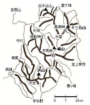 市街に接している鷹ヶ峰付近はちかくて気軽に行け、それで北山の面白さが少しばかりあるところだ。ここで言う範囲は氷室を中心として周山街道と鴨川源流にあたる雲ヶ畑川のとりまく範囲だ。山城五十山に該当する山は沢山、城山、十三石山の三山でいずれも名前が昔からついておりよく知られている。いずれの山も半日行程で十分行けるし、また一日かければ3山全部も征服可能だ。