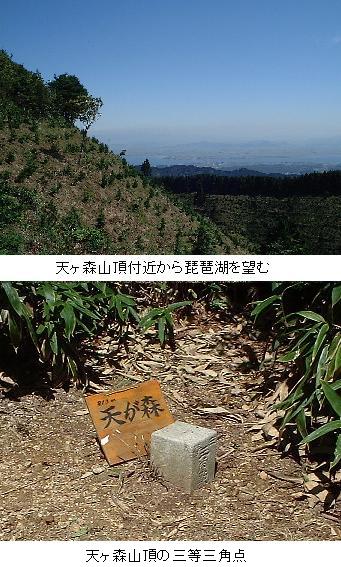天ヶ森に登るには百井からのルートが最も簡単で、百井までは皆子山のところで言ったとおりだ。百井の学校跡の前の田んぼから東南に向かって藁谷を入ると百井旧峠からの林道に合い、なだらかな道を登っていくと1時間たらずで峠に達する。この峠の50メートルほど下から進行方向に向かって右に入る。車道が曲がっているので錯覚して左に入らないよう注意がいる。ここで道標に注意して尾根筋にそって踏み跡をたどると20分程度で三角点に到達することができる。1996年(平成8)7月に行った時点では、頂上の東側は伐採がすすんでいて琵琶湖がよく見えて美しい。頂上からは尾根筋に、はっきりした踏み跡があり1時間程度で三谷峠に達することができる。この間、ところどころから琵琶湖を望むことができ快適だ。三谷峠はかつて美谷峠とも見谷峠ともいわれたが、三谷川の上流にあたり京都バスの三谷口と百井の日ノ子を結んでおり、皆子山登山のアプローチに利用されているルートの一つだ。三谷峠から三谷口へは琵琶湖を眺めながら急坂を降り林道を経て1時間程度で達することができ、また日ノ子へは薄暗い林のなかを下り20分程度で日ノ子橋に出られる。