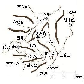 大原から北へ6キロメートル、途中の集落の真西に812.6メートルの三角点がある。この山を天ヶ森(てんがもり)というが、べつにナッチョとか旧京都一中山岳部が名づけた高谷山とも呼ばれることがある。いずれにしても国土地理院の地形図には載っていない。天ヶ森というように山の名前に森がつくのは四国地方にはよくあるが、山城五十山のなかで、岩倉の箕ノ裏ヶ岳は別名、藤ヶ森というので、これを除けば天ヶ森だけだ。天ヶ森は不便な位置にあるのであまり人気のない山の一つだ。よく似た名前で天ヶ岳(あまがだけ)というのが百井峠のすぐ南にあり三角点はないが、北山歩きをする人は、一度は行っているほど、よく登られる山だ。天ヶ森と天ヶ岳は接近した位置にあるので間違わないようにしたい。