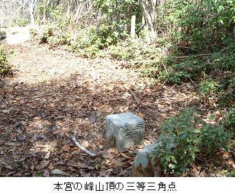 この山は京都市街からは不便な位置にあり、なかなか行く機会が少ない。この本宮ノ峰という山名も最近の書籍で見つけたもので、三角点はあっても地形図には山名は記されていない。醍醐山の南にあたるこの山の周辺は丘陵地帯の独特の美しさがあったが、近年はゴルフ場も開発され景観を損ねている。本宮ノ峰は上醍醐開山堂を起点とする回峰道といわれている行場巡りのルートちかくにあり、約1時間で到達できる。開山堂の東の鳥居をくぐると「右じゅんれい道」の道標があり笠取、岩間寺方面への道になっている。5分ほど降りたところの右側にも鳥居があり奥院本宮道の道標が建っている。この鳥居をくぐり尾根道を20分ほど行くとまた鳥居があり、ここから2ヶ所の行場へ行くことができる。一つは岩屋、他の一つは東の覗きで、ここからは千頭岳や笠取方面の眺めがよい。東の覗きから尾根に登りさらに南にすすむと本宮ノ峰の三角点に到達する。1998年(平成10)2月に38年ぶりに登ったときには山頂には本宮の峰のほかに「堂ヶ背」という三角点の点名の表示もあった。