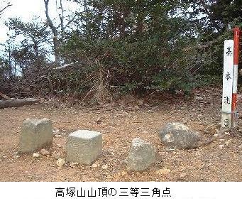 この山だけ登るには醍醐から二、三のルートがあるが、千頭岳とあわせて登ると一日の行程として楽しむことができる。千頭岳から前出のゴルフ場までは難なく降りることができる。クラブハウス前の舗道を横嶺峠へ向け30分ほど下ると、送電線下を2ヶ所横断する。二つ目の送電線のさらに50メートル下に、舗道から西へ分岐した山道がついているが、道標もあり分かりやすい。この山道はほぼ平坦で歩きやすく約10分で高塚山の三角点に到達する。頂上からの展望は京都南部が見えるのみで音羽山や千頭岳にくらべると劣る。山頂からの下りは西へ尾根つたいに降りると分かれ道があり、いずれにしても松林のなかのはっきりした道を醍醐に降りるが、北は地形図どおり朱雀天皇陵の北へ、南は長尾天満宮に1時間たらずで降りることができる。これを逆に登るとすれば、登り口には道標もなく一苦労するであろう。なお高塚山へは牛尾観音の桜の馬場の手前からも道がついており、ゴルフ場舗道の分岐から少し高塚山へ入った山道に合流する。以上は1998年(平成10)1月確認ずみ。