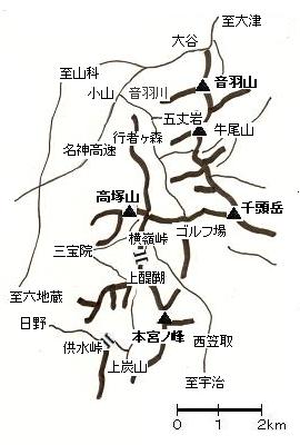 比叡山からつづいている東山連山は山科で二つに分かれ、一方は東山三十六峰の南端の伏見で終わり、他方は京都と滋賀の境となって宇治から、さらには奈良方面にまでつづいている。ここでいう山科・醍醐付近というのは後者で山科以南についてのことだ。この山塊は東山三十六峰よりもずっと山らしい山で標高こそ低いが、渓谷もあり尾根筋からは琵琶湖の眺めがすばらしい。また京都市街から交通の便もよく半日でも楽しめ、気軽に行くことができる。