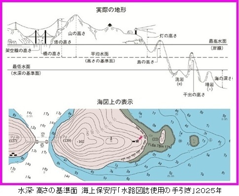 高さの基準面には平均水面を採用しています。ただし、干出岩(かんしゅつがん)の高さは最低水面を基準面としています。干出岩は最低水面(略最低低潮面)と最高水面との間にある岩であり、 満潮時には水没し、干潮時に水面上に露出します。架空線及び橋の高さは最高水面を基準面としています。